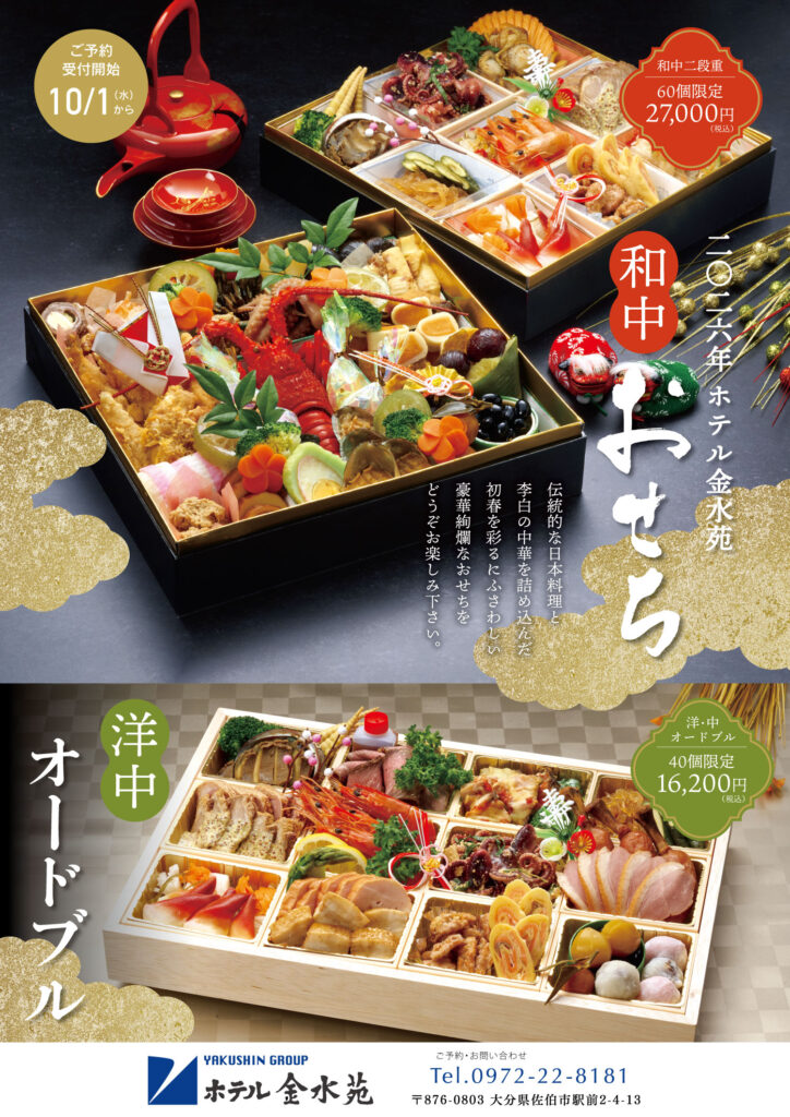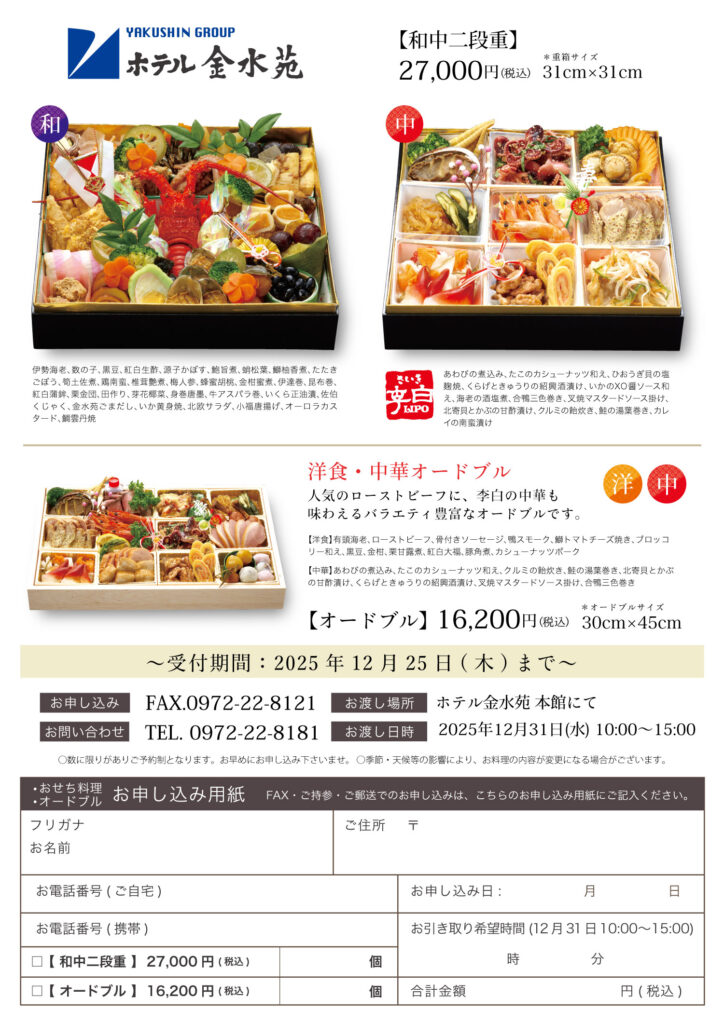おせち/オードブルのご予約受付しております 2025年10月24日 ご案内 新着 毎年大変ご好評いただいております、ホテル金水苑の「和中おせち」「洋中オードブル」を今年もご用意いたしました。 ・和中二段重 27,000円(税込み)/ 60個限定 ・洋食中華オードブル 16,200円(税込み)/ 40個限定 ※数に限りがございますのでお早めにお申込みください。 ご予約お待ちしております。 TEL:0972-22-8181