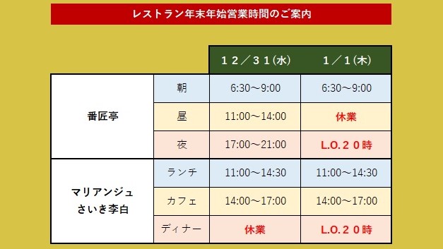 いつもホテル金水苑をご利用いただきありがとうございます。 年末年始の営業時間を下記の通りとさせていただきます。 事前に営業時間をご確認の上、ご来店いただきますよ…